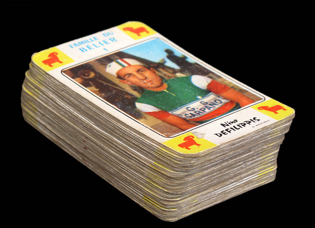 The deck is composed of 60 cards, 12 families of 5 cyclists, grouped by their actual astrological sign. Why should anyone think of grouping cyclists, of all people, by their astrological sign is something that escapes my comprehension. Maybe that is why some rather unknown riders are included; maybe not too many champions are born under certain signs.