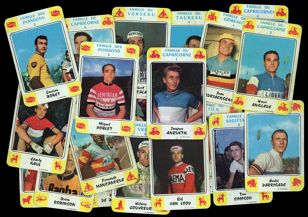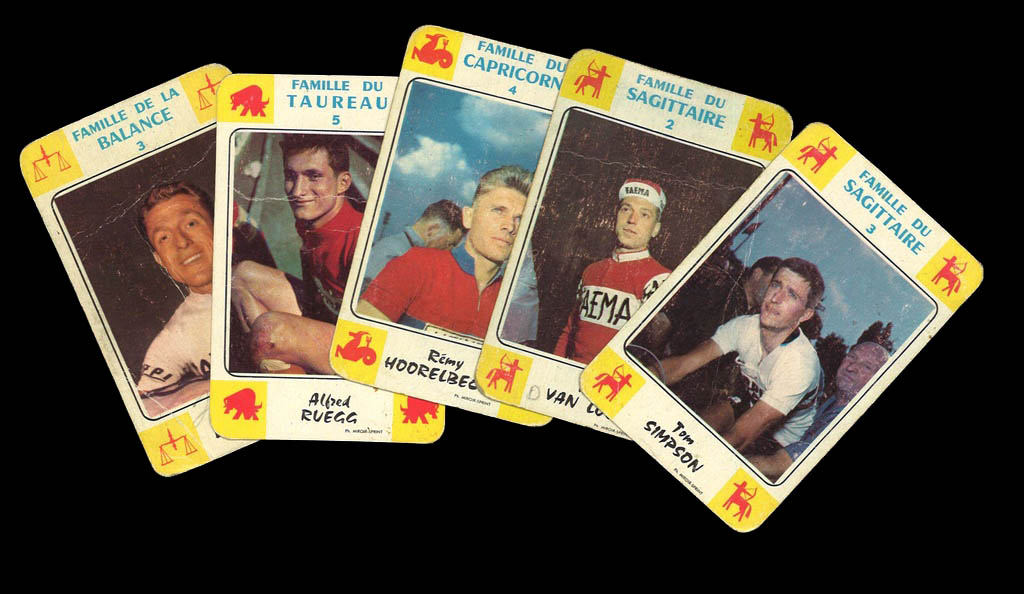 It is a quite weird French "Happy Families" game that mixes cycling and astrology. As in other contemporary card games, the pictures are credited to Miroir-Sprint and, lacking other references, I have reluctantly attributed the game to Miroir-Sprint (as publisher). However, since complete sets are so rare, my guess is that these cards must have been given as a bonus with something else, whatever that may have been. Information welcome.