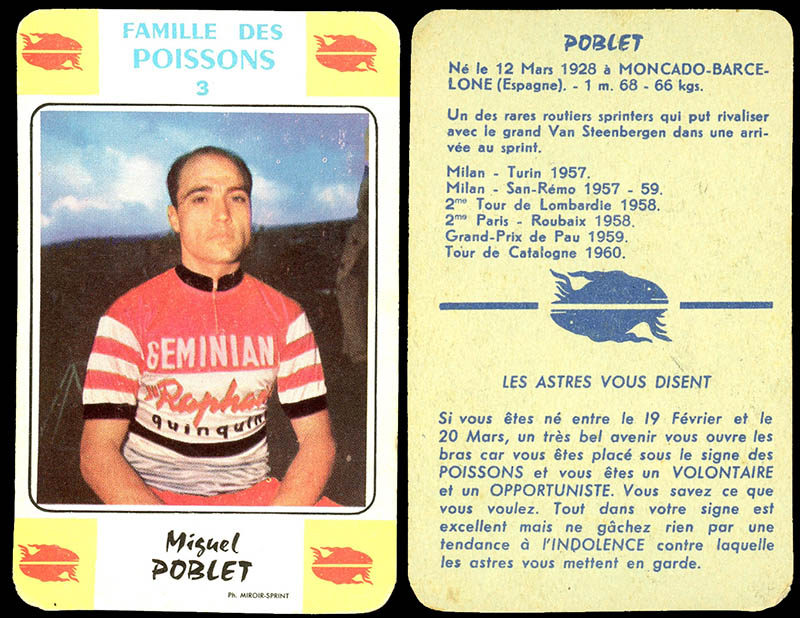 Here is my all-time favourite rider. By the way, Poblet was not born in "Moncado" (which does not even exist), but in Montcada. Since the official name of the town at the time the deck was made was "Moncada" (the Catalan "t" missing, courtesy of Spain's fascist regime), that is probably what was meant to be written on the card. Unless, of course, someone made a deliberate mistake to avoid the fascist-imposed town denomination. Not really likely, but I would like to think this could be the cause of the misnomer.