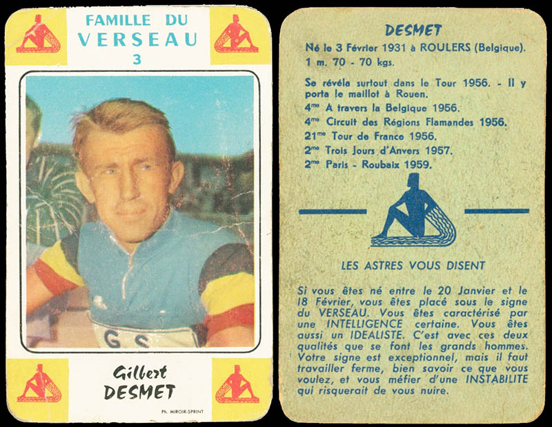 There are at least four different editions of these cards, as you can see by the different backs. The two cards on the left are both Rick Van Looy's. One of them (the one on the left, maybe the first edition) did not include the cyclist's name on the back, and did not depict a distinctive zodiac sign, as is the case with the other three backs. Even though three of the four must have been later reprints, nobody bothered to update the cyclists' results. And, of course, the astrological "information" does not change for the riders of the same sign, as you can see in the two cards of the Sagittarius family,