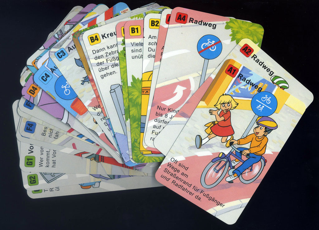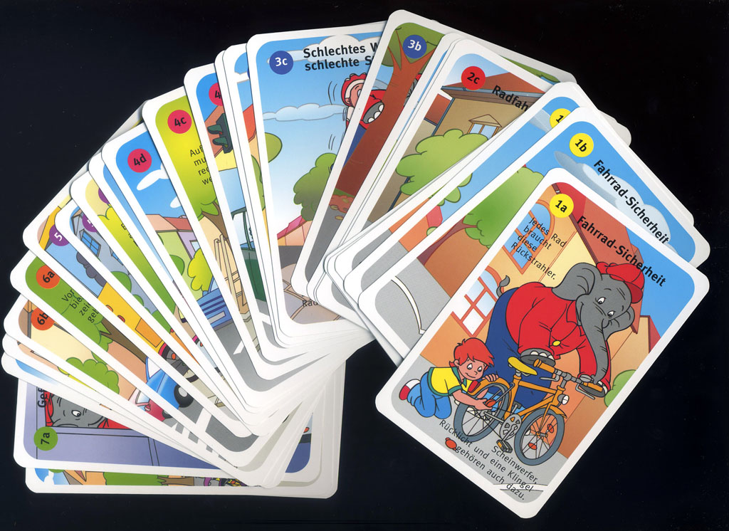 Here are a couple of simple kids' games made in Germany. They are very similar (same title, same editor, almost same rules, even same back of the cards), but I guess you can assume they are different games. Or maybe not (anyway who cares?). Of course Benjamin Blümchen is an animated children's television show very popular in Germany (though quite unknown in the rest of the world), and is used here to teach safety rules.