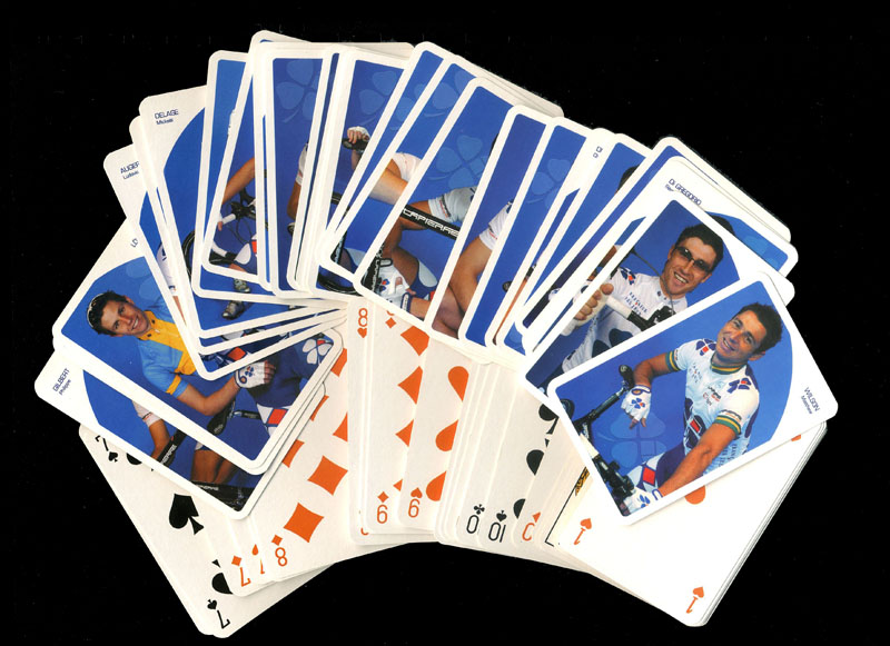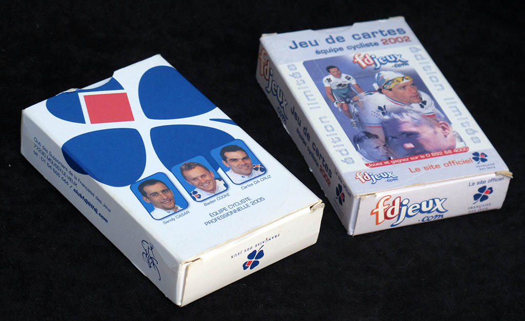Most cycling teams issue series of postcards featuring each season riders. Since the sponsor of the FdJ team is related to games, one can expect some kind of game-related memorabilia. What we have here are two standard poker decks issued in 2002 and 2005, in which there are some extra cards featuring the FdJ riders. These cyclist cards are not used to play.