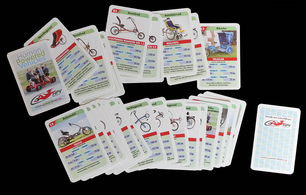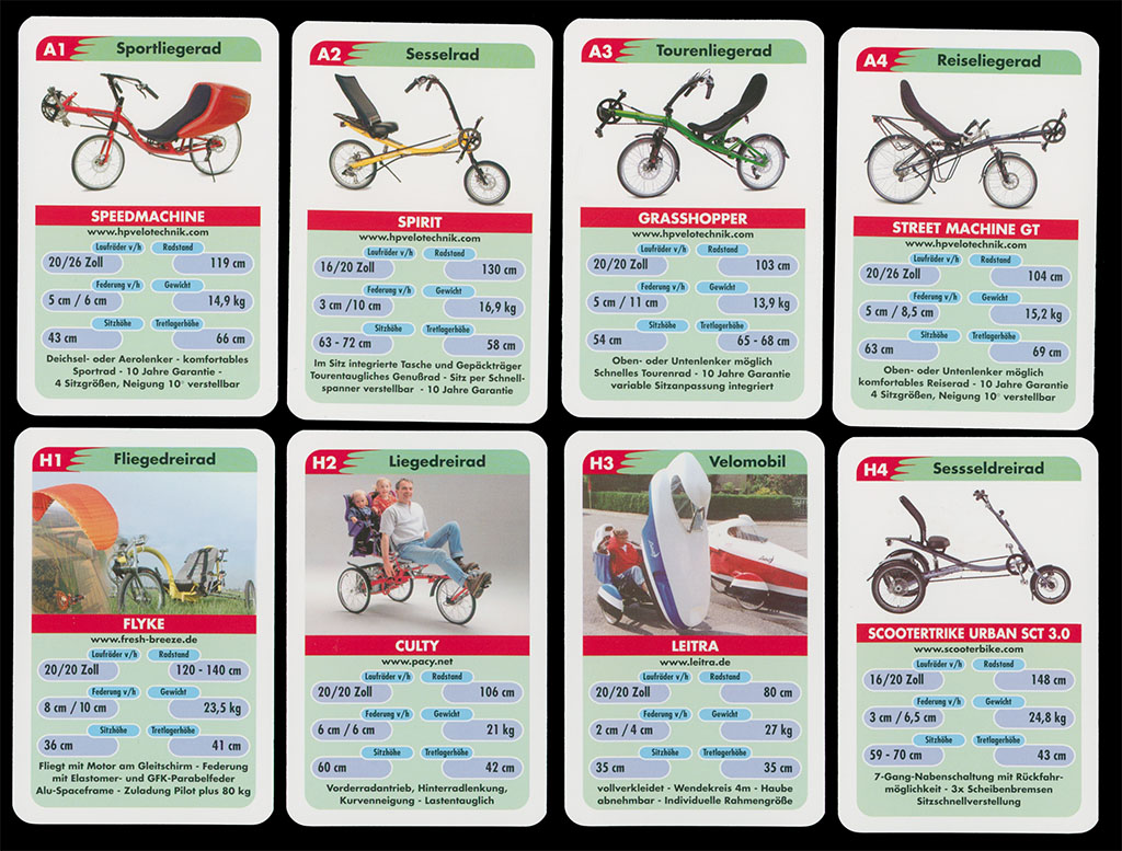 Another combined highest-values/happy-families card game, featuring unusual bicycles (or rather "human-powered vehicles"). In this case, the game is a promotion for HPV Deutschland, a company "committed to environmentally friendly mobility that ensures a high quality of life for everyone." You may want to compare this game to this other one, released the same year, which also features "different" bikes, but in that case (mostly) electric.