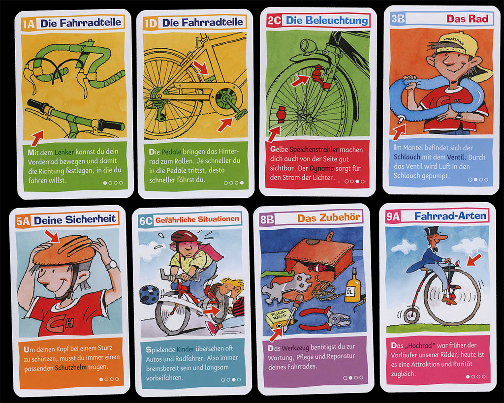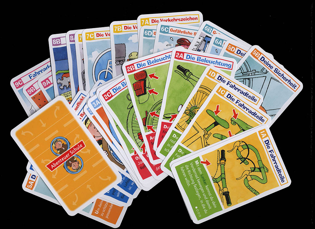 This game is part of the Abenteuer Schule (Adventure School) series, and is about "learning fun and safe behavior on the road". Each card explains an aspect of the bicycle.