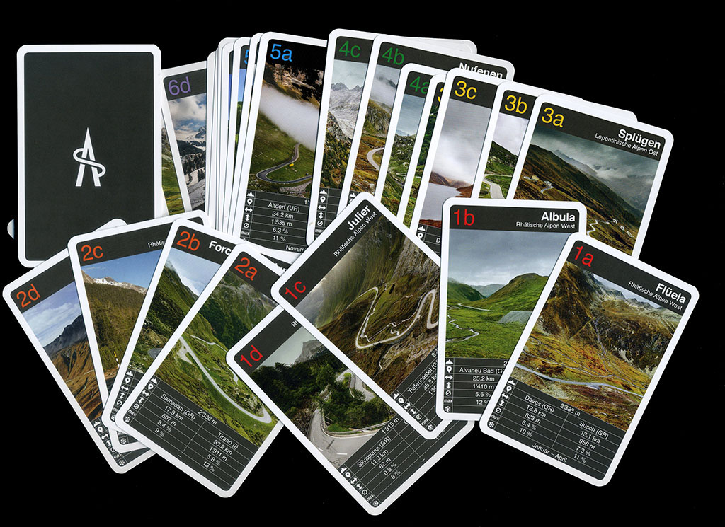 The game can be played as a quartet ("Happy Families") game or as trumps ("highest values") game. It eatures 32 cards, each one of which presents both sides of a Swiss mountain pass.To play the trumps game, players have to decide before the game starts if they are going to play with the rioght or left side of the card, so in fact you have two trumps game in one.