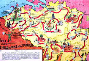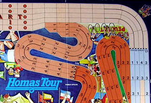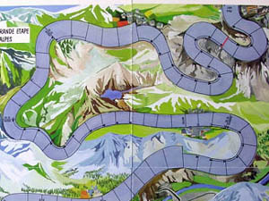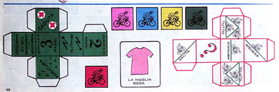 Being a particular subclass of the sports-replay-racing-games category, one expects cycling games to have some kind of distictive features that makes them different from, say, horse race or motorbike race games. R.C.Bell describes a horse racing game of mid-XIXth century, "The Game Of The Race", thus: "It sported an oval track. The riders progress was controlled by the throw of a six-sided die. Along the course were hazards."(3) Of course, some early cycling games were not more specific than this (except, of course, the counters were NOT in the form of horses). Other early games were literal adaptations of "The Game Of Goose" superimposed on a map. At least these were good for learning geography. But times have changed, and what made a nice, much sought-after, pre-WW1 game, is probably unacceptable eighty years later.