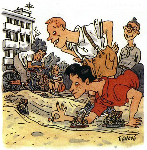 A couple of games added to the unpublished games section. In the book "C'est Mon Tour" (Eden, 2003), a compilation of Tour de France souvenirs by French writers, there are two descriptions of games played in their childhoods by Eric Fottorino and Gérard Mordillat. Fottorino also mentions his game in the book "Petit éloge de la bicyclette" (Folio2€, 2007). Both games have some similarities, using metal riders they already had (that was France) and a couple of dice. What strikes me most is that both use 2 dice to move riders. The games I used to invent when I was a kid used one one die. My guess is that in Spain anybody doing a similar game would use just one die, while I am not so sure in other countries. I would love to hear your opinion about it, and to know if you made similar games.