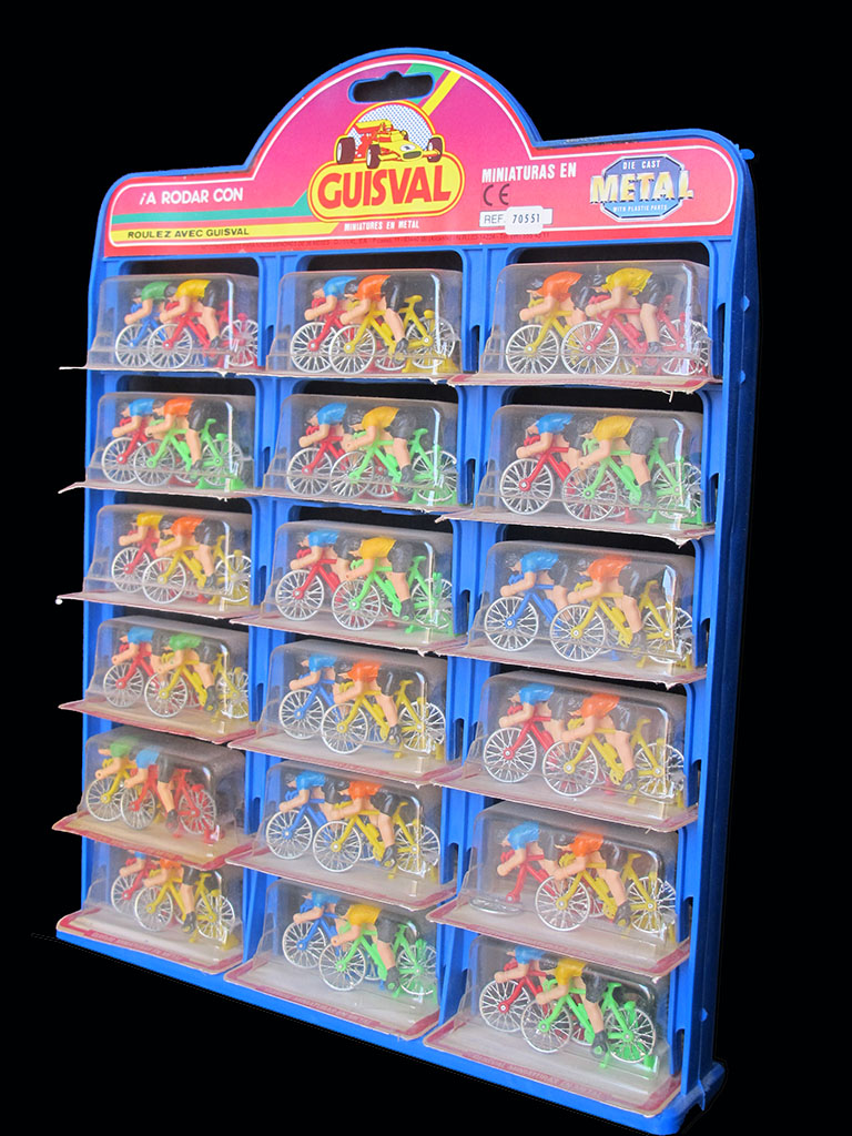 Guisval is a Spanish brand (from Ibi, Alicante) that has been making die cast metal models since 1964 and is still in business. They are better known for their 1:64 car models, but they also produced these cyclists in the 1990s . You may argue that they are strikingly similar to those in the Corgi Toys gift set 13 Tour de France from 1968. I guess they are.