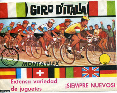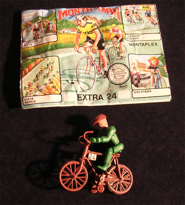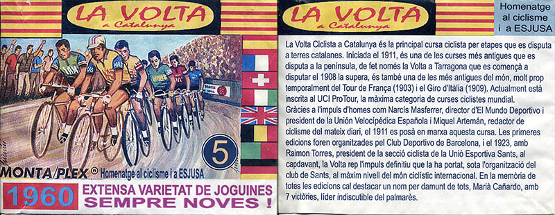 Avoid whatever Montaplex envelope marked "Nueva Generación" or "Homenatge" you might find. These are modern reproductions (though the riders in them might have been made by Montaplex; the ones I found in this envelope Volta a Catalunya were of the the low-quality mid-sized type Montaplex. By the way, there was never a "Volta a Catalunya" montaplex bag (nor any "Anquetil" or "Perico Delgado" bag, which I have also seen for sale).