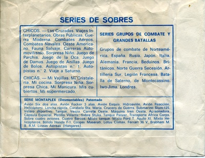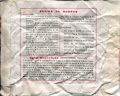 Esjusa (ESpañola de JUguetes, S.A.) began to manufacture surprise envelopes with small plastic toys within in the early 1960s. These envelopes were a huge succes and at some point Serjan, who had been distributing them, came up with the word Monta-Plex for the series and made their own company. The toys were still manufactured by Esjusa and at some point they were distributing similar envelopes with the same figurines. Both companies were from Barcelona, by the way, and let me warn you that the story might be a little different depending on where you read it. As far as I am concerned (or at least for the scope of this article) they are all "Montaplex". If someone involved with these companies wishes to make some precisions, feel free to contact me.