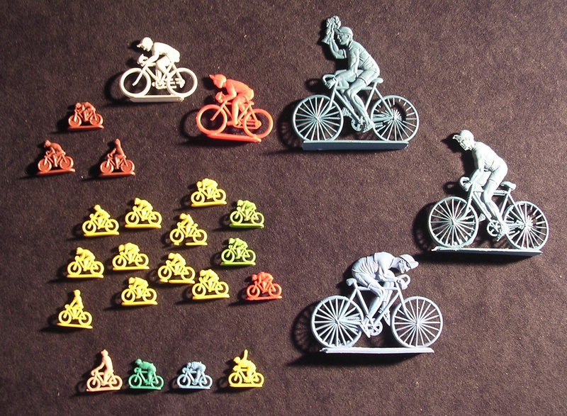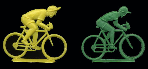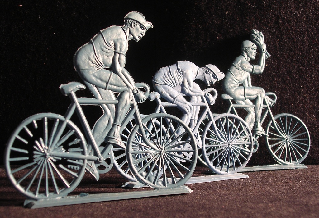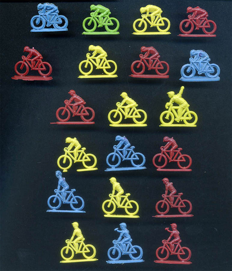 The contents of the kept changing over time. In general you could expect to find around 20 tiny low quality ciclists (roughly at scale 1/72), all the same colour, and some extras, which might be spectators, motorbikes... The figurines were uncut inside the envelopes. Although the riders were all in the same colour in the same bag, generally different bags carried different colours, so you could have a nice multicolour peloton. The quality of the contents also varied with time. In the 1/72-ish scale there were found in three series. The ones which I will qualify as "of lower quality" featured riders in 4 positions on the bike.