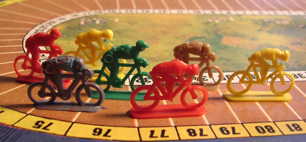 Some time ago I was able to purchase some original unopened Montaplex bags. This gives a good example of what you might find in them. Though there were both "Vuelta a España" and "Tour de France" bags, the contents were similar. Almost all the riders were yellow (a couple of bags had blue riders), all the bags had spectators (mostly green), some of the bags featured a camera or a banner (occasionally both!), and all the bags featured one or two (!) Ford-T cars with no apparent relation with cycling. Most of the paper bags were in poor condition but I have saved the best unopened ones to trade. Email me if if you are interested.