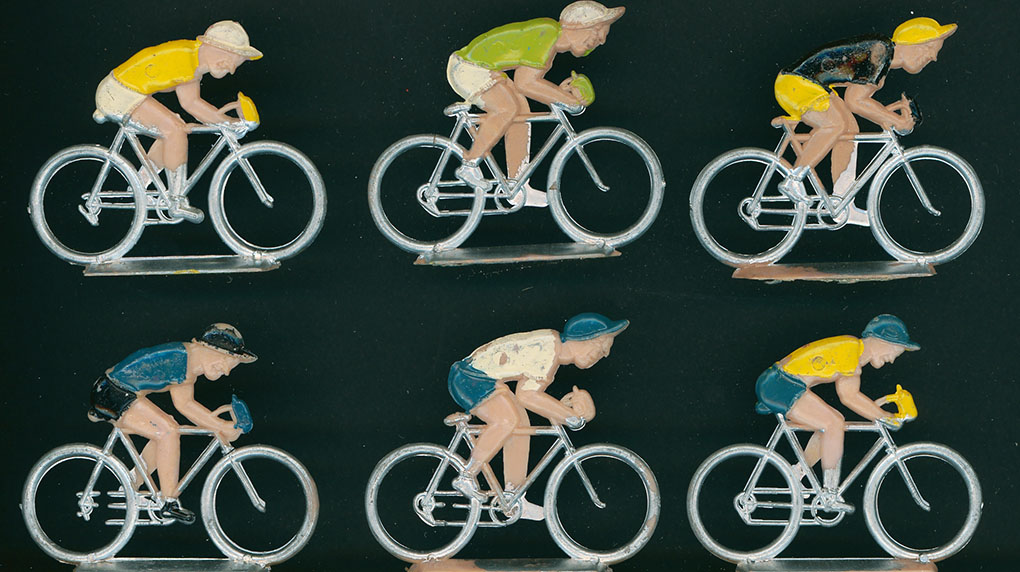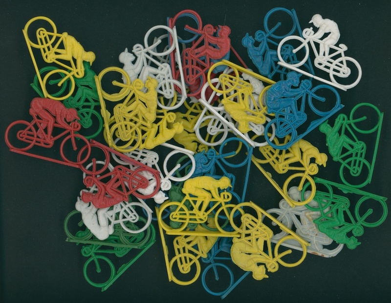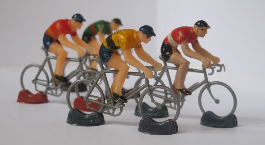 These cyclists are detachable (they can be removed from their bikes), and the plastic bases are detachable too. If you check the (first) peloton picture (above), you may notice that I do not have enough bases to mount two under each bicycle. However, my guess is that there should be two bases and that some of them have been lost over time. For the record, I have a few more bases than riders, which means that in the other case some riders and bicycles would have been lost, which is not that plausible since I have the same number of each.