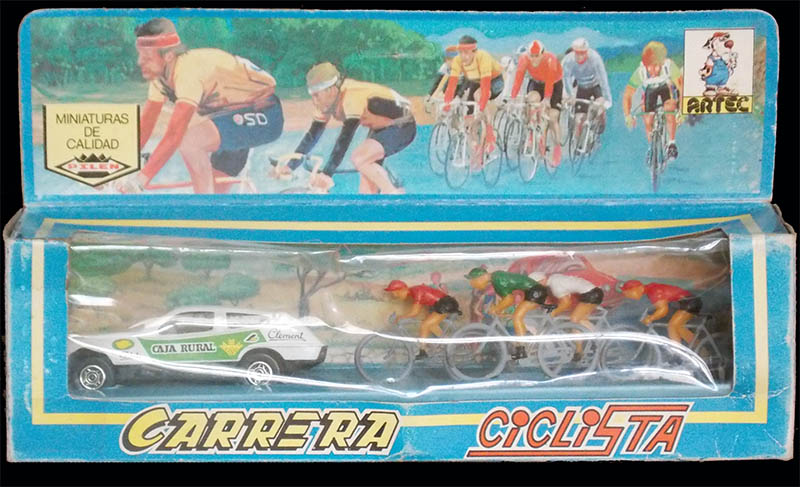 Box made by Artec-Pilen (from Ibi, Alicante) with a Caja Rural team car (Kelme, ONCE and Reynolds teams cars were also available) and four Aludo-inspired cyclists. They are very similar to those used for the game Sprint, but the colour of the bicycle is different. I have seen such boxes with Sotorres Starlux and Salza-inspired riders too. These boxes were made in the late 1980s or early 1990s.