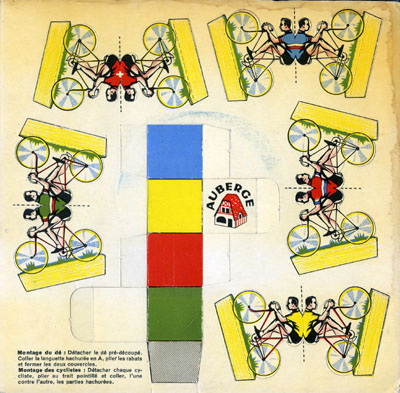 Most copies of the game have lost the cardboard riders. If this is the case with yours, I have included a ready-to-print high resolution scan of mine HERE (also available from the "make your own cycling game" section of the site). Notice the multicoloured die. Fortunately, It can be replaced by a normal die if it is lost or damaged.