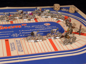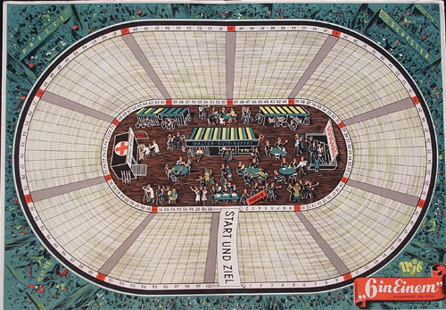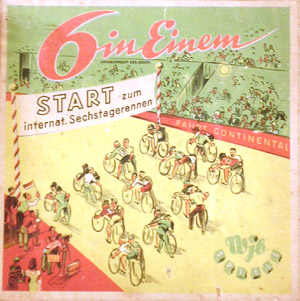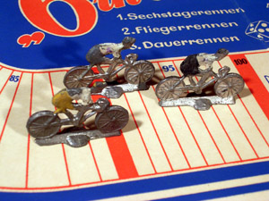 Old german track cycling game with metal riders. I guess it can be considered the German veldiv game. There are some different versions of the game. There is the box containing metal riders and a quite disappointing box. The smaller box contains only the riders (no board, no rules) while the envelope contains a much more elaborate board.