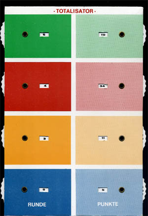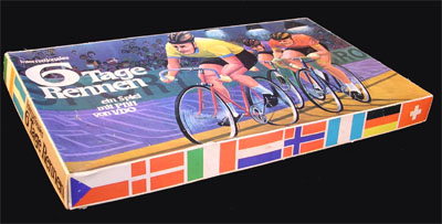Promotional track cycling game from Germany. This is not a game from former Eastern Germany (as I thought), but a promotion game of the big automotive engineering company VDO. (Thanks, Siegfried, for the correction). The game itself is not specially interesting, it is remarkable just for the Speedometer (a spinner, actually) used instead of a die, and the Totalisator (a cardboard lap and points counter).