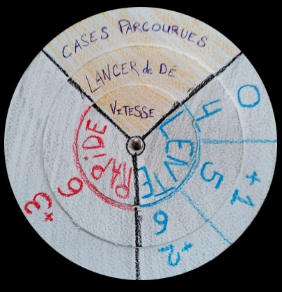 There is a "Pace Wheel" (and again a simplified version for the junior game) made of three concentric circles which indicate the number of squares traveled per turn depending on the terrain and pace (outer circle), the additional necessary points to start a successful breakaway (middle circle) and the additional necessary points to successfully counter a breakaway (inner circle). You get the idea...