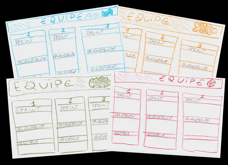Gilles graphic designs are rough, as you can see. (In a prominent place in his site we read a quote by Linkedin's founder Reid Hoffman that says "If you’re not embarrassed by the first version of your product, you’ve launched too late"). However, don't let the design fool you. The rules are not so simple as one might think. In fact, the are NOT simple. Even the Junior version is not that simple. I would not be so sure a six-year-old can play it. (Or maybe I should quote Groucho Marx again).For instance, at the beginning of the game each player allocates a total of 15 points to a racer, divided between the sprint, stamina and climbing skills, which he writes in his team sheet (see picture above); each racer will therefore have a unique profile. (I am talking of the "senior" version here; there are simplified team sheets for the junior version).