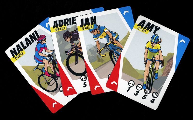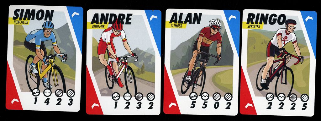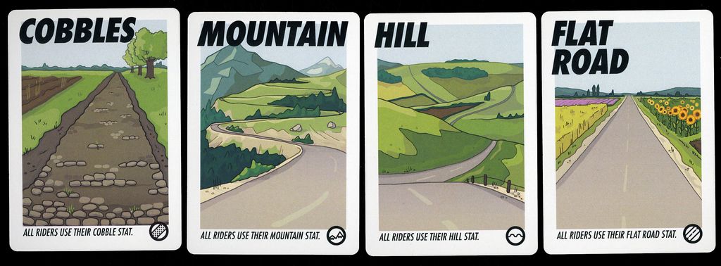 The are four types of terrain, and each rider has different qualities for each. SInce terrain cards are played as normal cards the stage configuration is dynamic (as opposed of being predetermined) and players cannot be sure of which terrain they will find at the end of the race, So their interest is to have good riders for each type of terrain in the break.