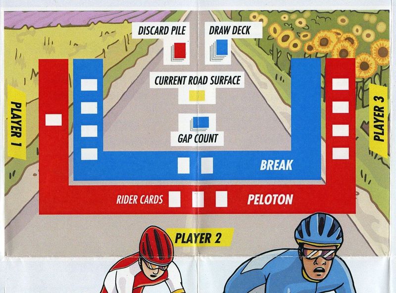 As you can see by the layout sketch above, the riders in the game are divided in two packs (peloton and break) and the game consists, basically in having your best riders in the break (attacking the pack, thus the nicely descriptive name of the game).