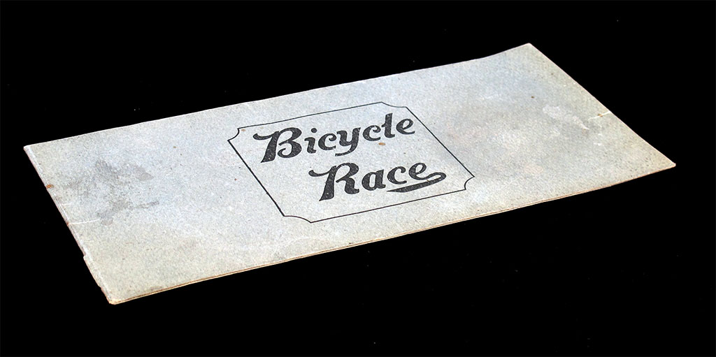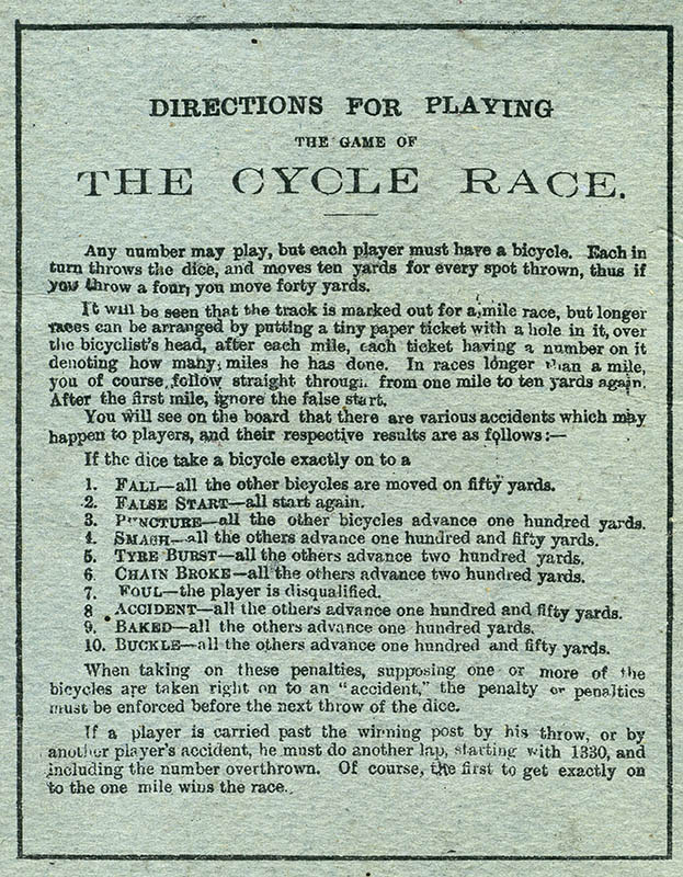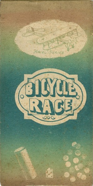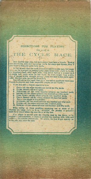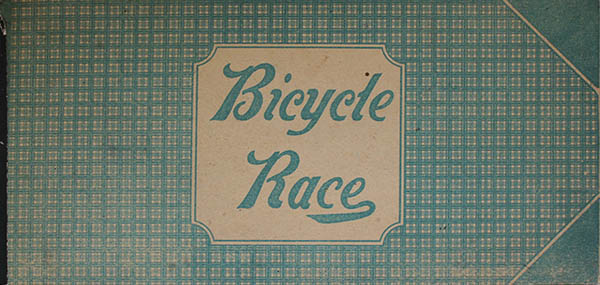 This is a simple turn-of-the-century English game. It is a simple folded cardboard measuring 51 x 13 cm (when unfolded), with the rules printed on the back. The rules state that "any number may play, but each player must have a bicycle". However, I have never seen bicycles -or dice, for that matter- included with this game, and of course they can be replaced by counters. The number of dice to be used is not specified.