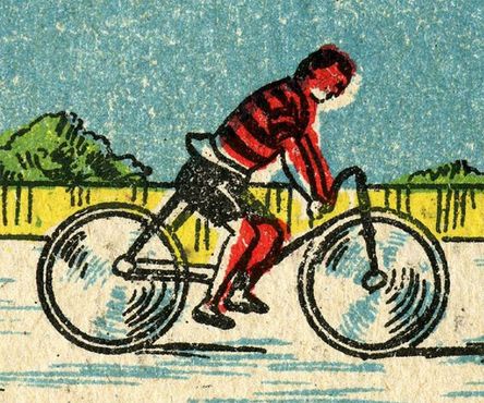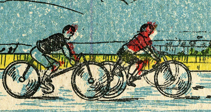 I am not an expert (yet?) in the history of the bicycle, but I think the rider on the left has lost the pedals and chain. No wonder he is the last in the race. On the other hand, the cyclist on the right rides a safety bike typical from the 1890s.