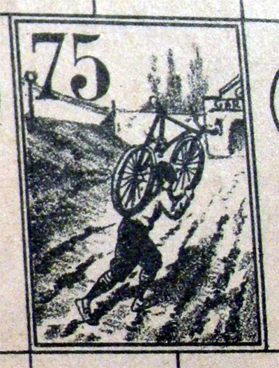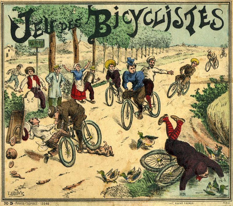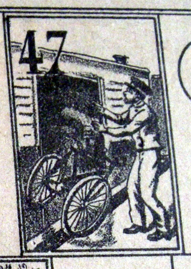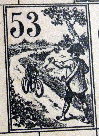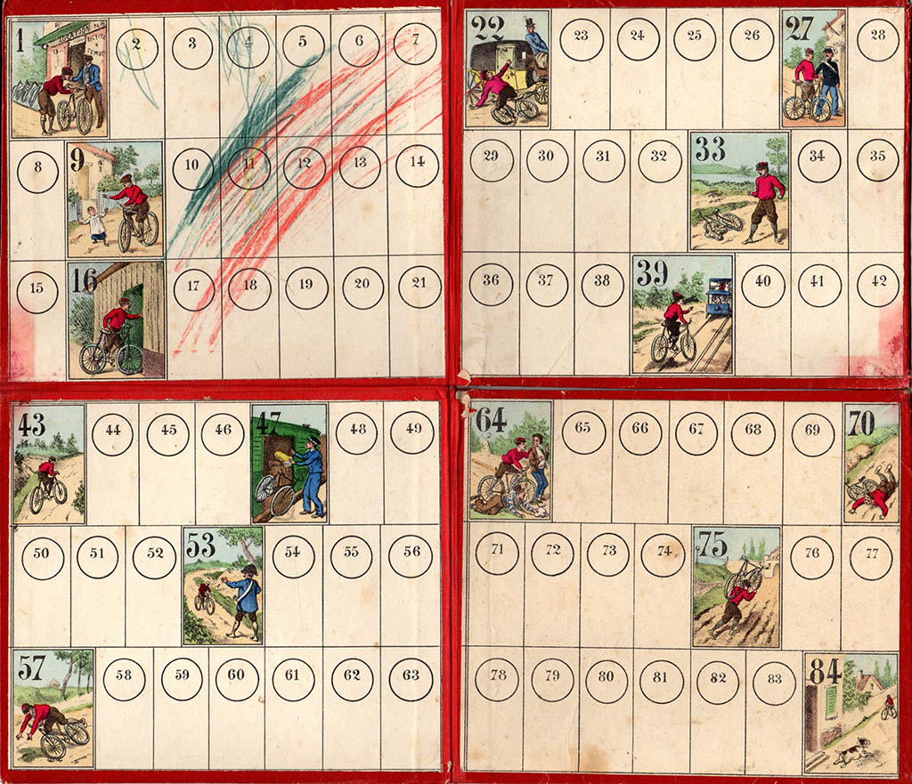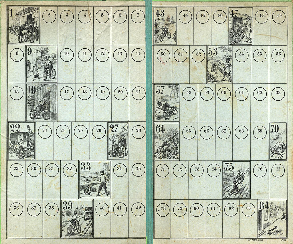 The rules of this game are quite hard to come by. (This game has been many years in the "missing rules" section of this website). Fortunately, Didier's copy had the rules, which mention six small bicyclists, to be used as counters, and a numbered teetotum. Both the rules and the use of the word "bicyclists" have a distinctive (though not conclusive) XIXth century flavour.