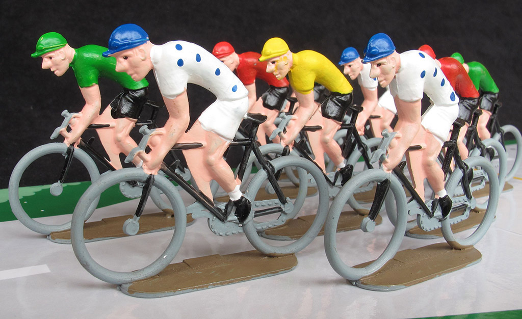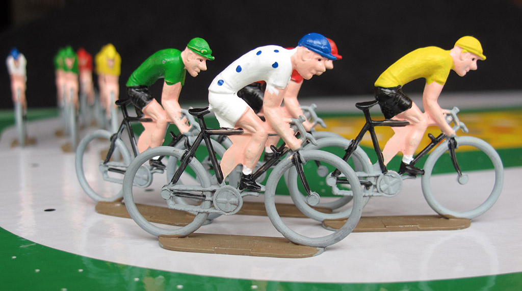 There are three different kinds of riders you can buy for this game (check the game's website, link below). The basic riders are the small monochrome ones which you find in so many games (including my own Maillot Arc-En-Ciel). These are probably the best for the small board but the "peloton feel" mentioned above is somewhat lost with such small riders on the big board. Myself, I tried the metal Roger's the first time I played the game, and I do not want anything else, despite they are the most expensive. (As an advantage, they are less expensive than if you were to buy them separately).