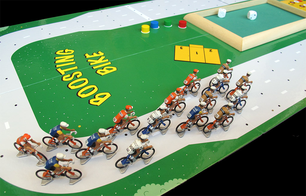 At the end of each turn, when the sixteen priders have moved, there is a phase called "Boosting" in which some riders benefit from an extra advance. Riders who are on a black dot just (diagonally) behind another rider (who is on a white line) move one dot ahead. Shoud the rider, by this movement, find himself again diahgonally behind another rider, he continues advancing. This can be considered an "aspiration rule". If the rider behind whih he finds himself, is of the same team, thden he rider advances two more dots. This part, more than aspiration, I see as one rider pushing his teammate.