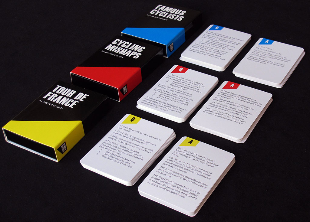 My favourite set is "Cycling Mishaps", of course. Most of the existing trivia games are explicitly based on the Tour de France and "Famous Cyclists" is not an unusual subject either, but "Cycling Mishaps" is unexpected.