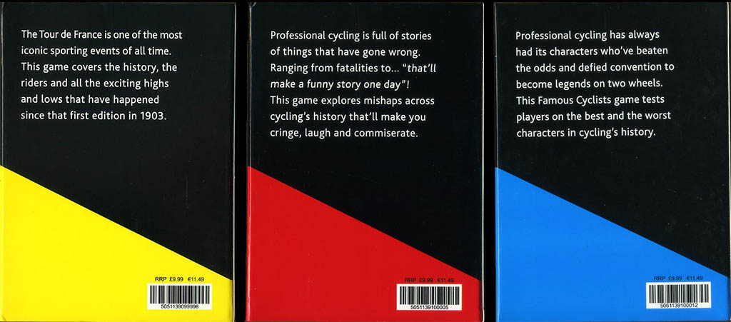 However, in my head I consider these a single game in three parts, not the least because you get a discount if you buy the three of them. (Yes, I know, trivia games are not among my favourites and I let it clear every time I get a chance, so I am not suggesting you should buy these... However, if you are the kind of people that does like, and play, trivia games, if you were looking for an English language game with which to test your knowledge about pro cycling, then I strongly suggest to buy the three decks).