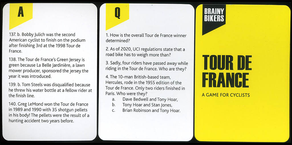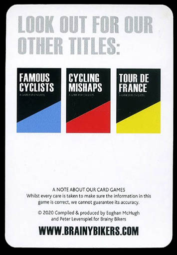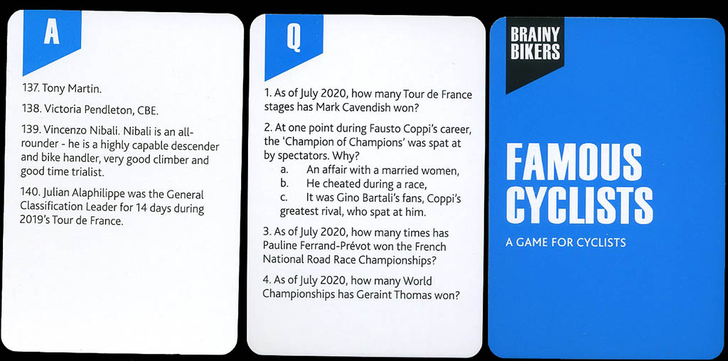 Each pack features 140 questions with the usual arrangement with questions on one side and answers on the back. The suggested (not really needed, are they?) rules of the game are not included with the decks but found on the maker's website. Since Grand Tours are raced over 21 stages, they suggest asking only 21 questions per quiz. And they add "Grand Tours also have two rest days - one after stage 7 and another after stage 14. You can also include a comfort break after question 7 and 14". Wise suggestion, I would say.