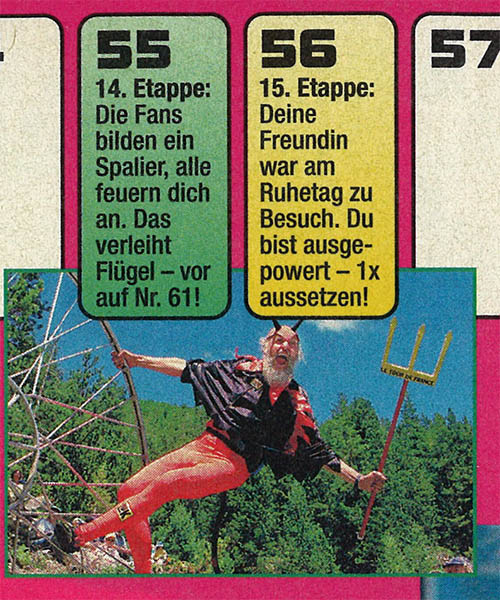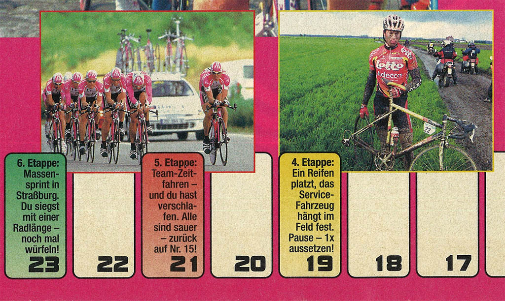 The two riders on the foreground are, of course, Jan Ulrich and Lance Armstrong. In case you wonder, the board measures 41 x 28 cms. As you see, the game does not look too complicated (provided you can read German).