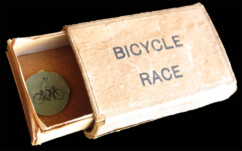 Sometime ago I received a present from David Wells, from TheOldToyShop.com. It was a small box, the size of a matchbox, with a carboard counter with a cyclist printed on it, which he had found in a flea market in England (thanks, again, David!). As you can see in the pěcture below the box has the inscription "Bicycle Race" on the top.
