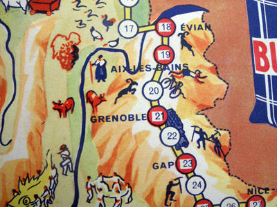 I wrote: "Learco Guerra, Kurt Stöpel, Edgard de Caluwé, Vicente Trueba, Antonin Magne and René Vietto. Of them, De Caluwé and Vietto are the youngest and their presence indicates that the game was probably not made before 1934 (ore else by a visionary). On the other hand, the absence of earlier stars like Alfredo Binda or Charles Pélissier (both of whom were active but well past their prime by 1935), or later superstars like Gino Bartali or even Sylvere Maes, is why my guess is that the game was made around 1935. Still, I cannot explain the absence of Romain Maes, winner of the Tour de France that year (except that the game was made just before the Tour) or of George Speicher, winner in 1934. However, it is worth noting that all the riders in this game except Learco Guerra took part in the 1935 Tour de France. What is quite weird is that only one of them made it to Paris, and his results were not so good anyway (René Vietto, 8th).