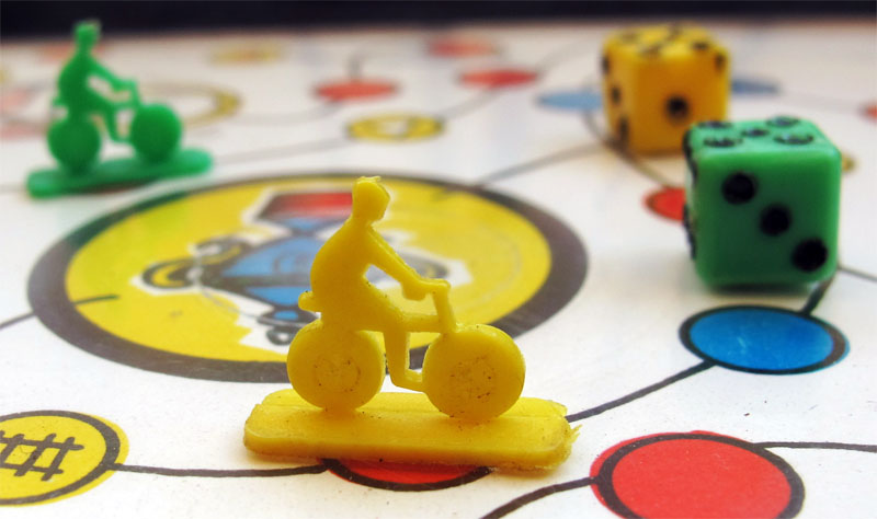 The game is very similar to this other one although it has been redrawn. One wonders why the world needs TWO games like this. However, this game is outstanding in at least one detail. The riders are among the smallest featured in board games, along with those in the (much bigger) Tour de Francia and those in Leader1.