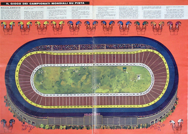 Track cycling game offered with the september 23rd, 1962, issue, as the cover of the magazine. It was titled "Il Vigorelli" after Milano's famous velodrome. It was included again in the inside pages of august 28th, 1966, issue, this time called "Il Gioco Dei Campionati Mondiali su Pista".