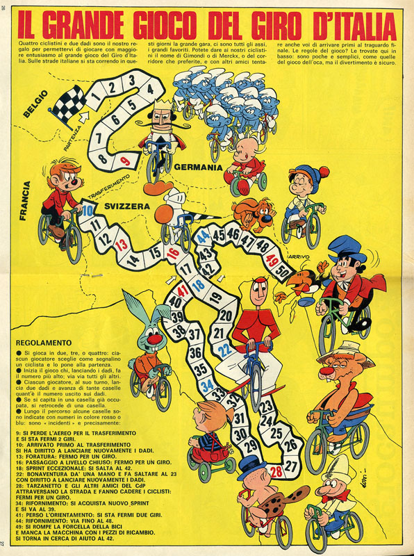 Game offered by the Corriere dei Piccoli on 1973, july 3rd. Four cyclists and two dice are mentioned in the first sentence. Maybe there was an insert with the magazine. Nowhere in the rules is said that the dice are not regular D6s, but I would not be surprised to find that they were not. Apart from that, it is a simple game of goose.