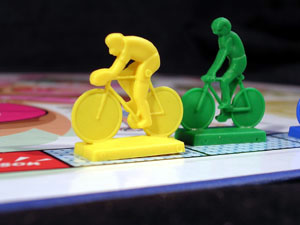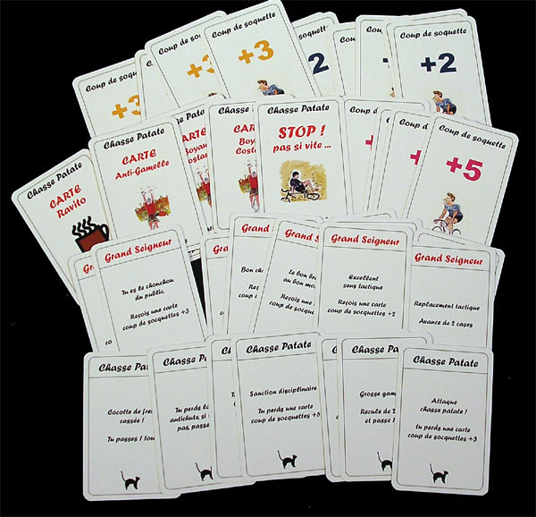 In this case we find teams of two riders (climber and rouleur). We also find 10 dice marked 1-2-3-4-BLANK-BLANK, but these are used as markers for the missing turns. The advance of the riders is controlled by two normal dice. A rider arriving at a black-and-white square draws a "chasse patate" card (which is bad), while a rider arriving at a red-and-white square draws a "grand seigneur" card, which is good. At the start of the games, the players receive some +2, +3 and +5 "tactic" cards (called "coup de soquette") which are played after the throw of the dice.