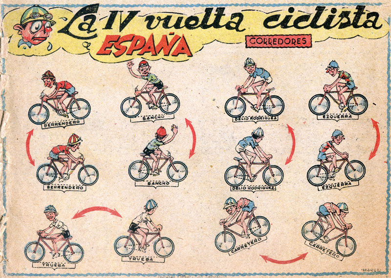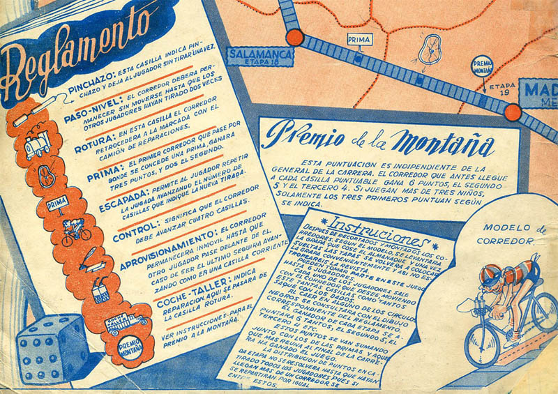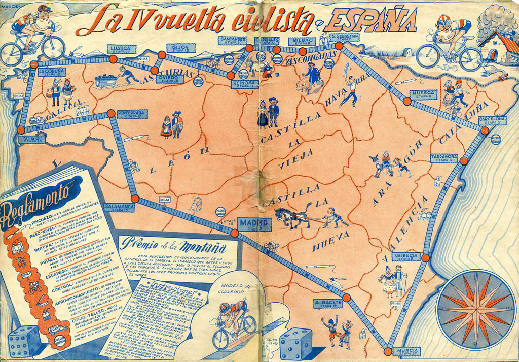 One of the first (if not the first) game dedicated to the Vuelta, included in the 1943 edition of the Almanaque Chicos magazine. It features the stages of the 1942 edition of the Vuelta. This was only the fourth edition of the Vuelta, since the race was organized for the first time in 1935 and was interruped between 1937 and 1940 due to the Spanish Civil War. It was interrupted again in 1943 and 1944 due to Spain's precarious economic situation.