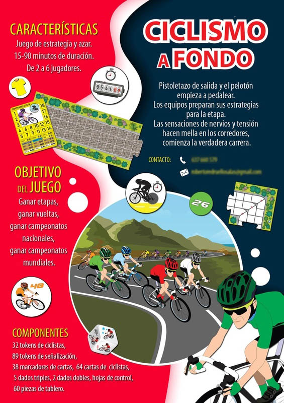 However, at least one of these games was released to the public. "Ciclismo a fondo" was available for a few months through a Spanish copy shop website. It was an unusual distribution strategy, almost a print-and-play game, except that you did not need a printer: you bought the prints, but you still had to cut and assemble the parts. Unfortunately, this strategy did not seem to work, and the prints are not available anymore. Nevertheless, all the work has not been done in vain, and I can (proudly) announce that this game is offered as a free print-and-play download for the first time (scroll down for the direct link).