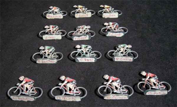 So I can be pretty sure that there are at least two riders missing (numbers 4 and 5, of course) but I wonder what colour they were. If these numbers have any relation with the game thy might be both yellow or one yellow and one red striped. Any of both possibilities would lead to 2 teams of three riders, two teams of 4 riders and one spare riders. It might make some sense (compare with the Eddy Merckx game, where there are also spare riders to be added to the teams depending on the number of players). Another possibility is that the two missing riders formed still another team, which would lead to a team of 4, two teams of 3, two teams of 2 and still a spare rider.