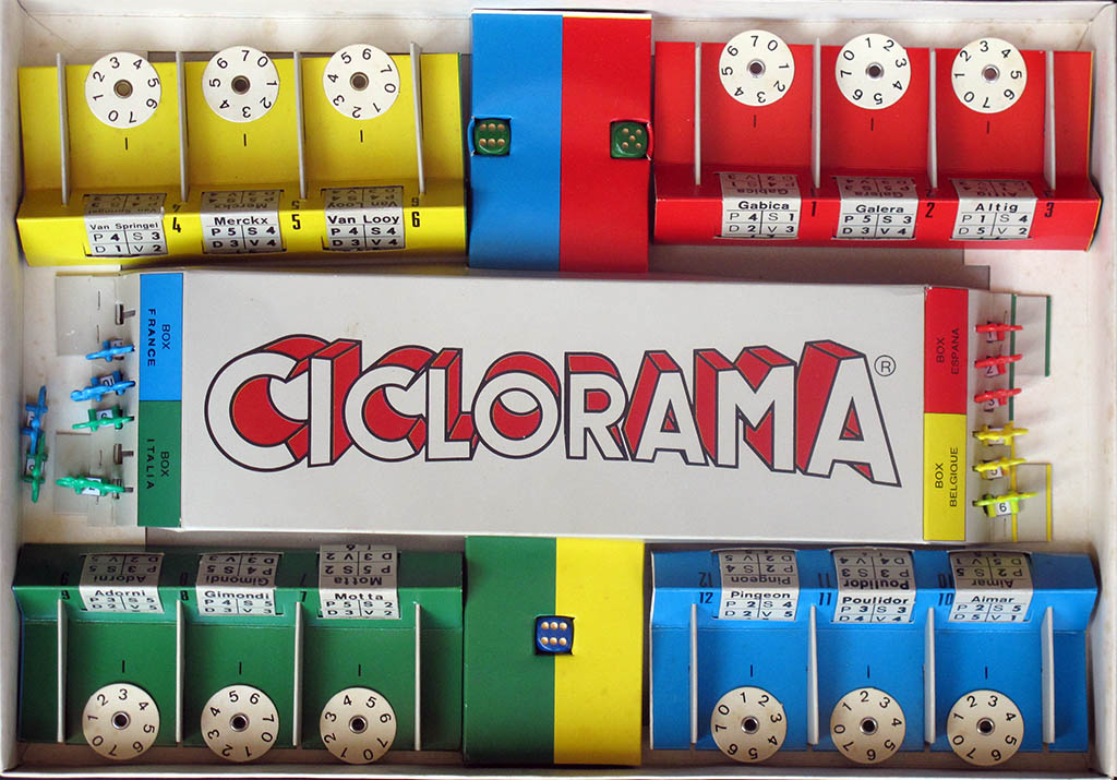 Though the teams are named after countries (in this case Italy, Belgium, France and Spain), the riders do not exactly match these countries. We find three italians (Adorni, Gimondi and Motta), three frenchmen (Aimar, Pingeon, Poulidor), three belgians (Merckx, Van Looy, Van Springel), two spaniards (Gabica and Galera) and a german (Altig). One might think that the teams are national teams and that the Spanish team has been strengthened with a German rider. Nothing is further from the truth. The fact is that before the start of the race the players draw by lot who has the right to chose first , and players select their riders according to their values and the kind of race the they are going to play, and not of their nationalities.