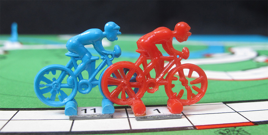 The other abilities do not decrease during the race, and are added to the value thrown with the dice depending of the type of terrain. Some extra points are also added to the throw if the rider is protected from the wind (behind another rider). But this total sum is not the value by which the riders move, since different types of terrain need different values to move throuh them.