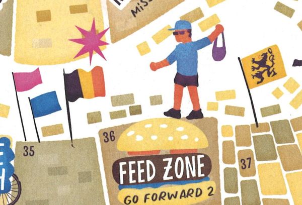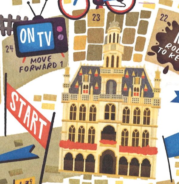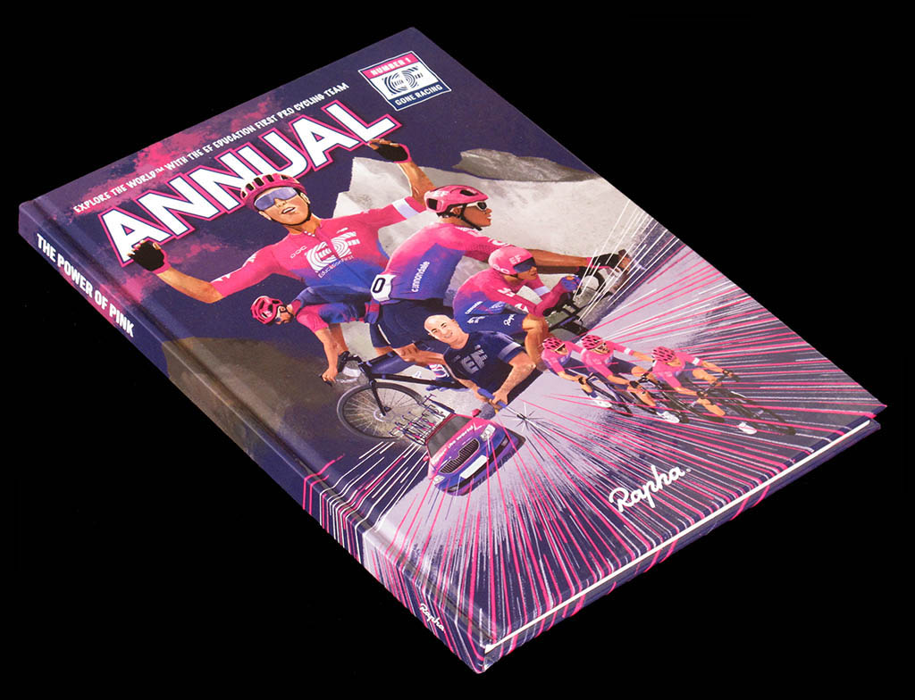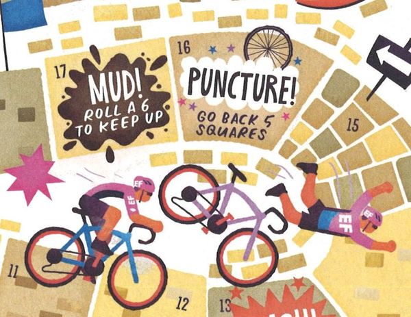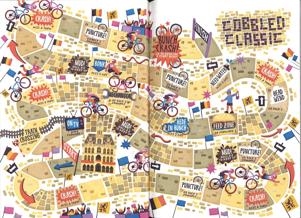 British cycling clothing manufacturer Rapha has recently issued a cartoon-formatted annual called "The Power Of Pink" to commemorate American cycling team Education First's 2019 season (or maybe, more accurately, Rapha's and EF's partnership). In this book, among cartoons, puzzles, quizzes and various pieces of trivia, we find this beautiful board by illustrator by Chris Dickason, supposed to be a game representing a classic cycling race.