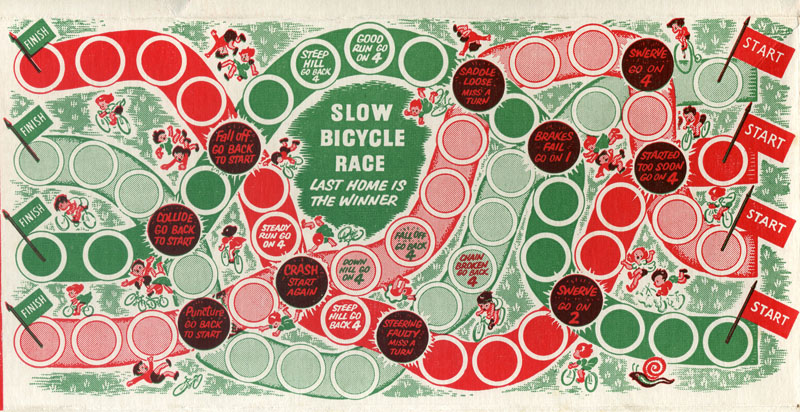 Sometimes the games are too childish to qualify as "cycling games". This one comes from a 1950s game compendium by Berwicks Toy Co Ltd. Strangely, though the game fits nicely in the box, its rules are not in included in the booklet, so I was not really sure that the game belonged to the box until I purchased a reissue (on the right) and found that, again, the game was not included in the rules booklet but still fitted perfectly in the box.