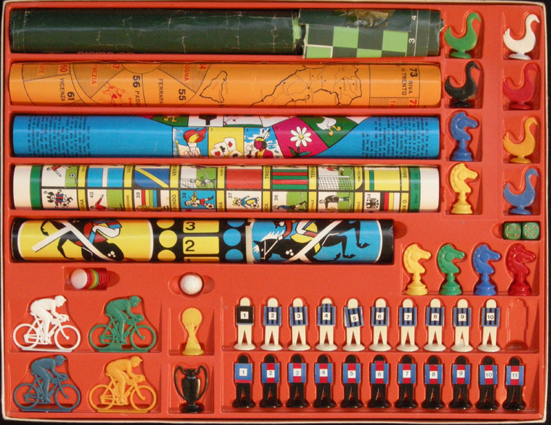 Unbranded (except for the logo) Italian combination box wich features 5 games: Game Of Goose (with no particular sports theme), horse-themed Ludo, football-themed game of goose called "Tutto Calcio", another football game called "Goal!", and a cycling-themed game of goose called "Gioco del Giro d'Italia Ciclistico".
