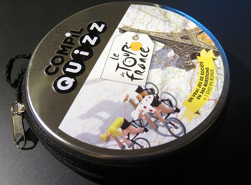 360 questions about the Tour plus a bonus DVD. That is, 60 pages containing 6 questions each. Either you throw a (non-included) die to decide which is your question, either you decide what question you want, bearing in mind that the higher the number, the more difficult the question, but the more points you can gain. Mmm... deep tactics here.