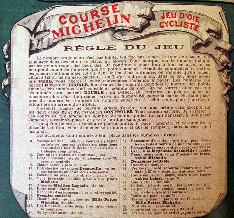 The game was included in the Revue Encyclopédique in May 1894 and was a promotion for Michelin tires and other related products.